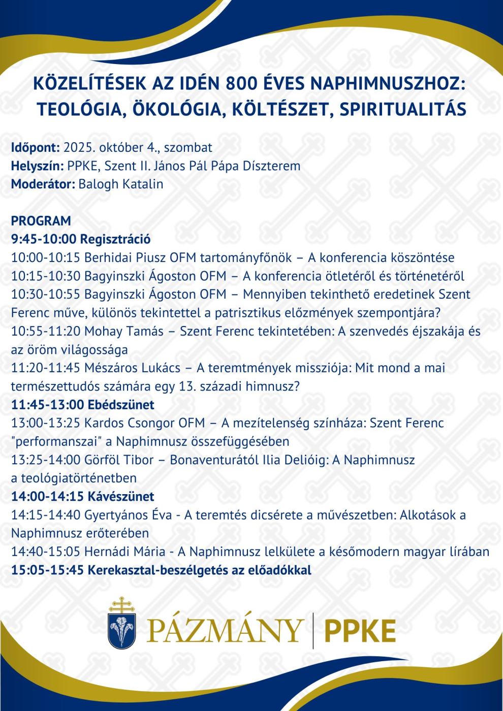 Pázmány Péter Katolikus Egyetem Szent II. János Pál Pápa Kutatóközpontja tisztelettel meghívja Önt a "KÖZELÍTÉSEK AZ IDÉN 800 ÉVES NAPHIMNUSZHOZ: TEOLÓGIA, ÖKOLÓGIA, KÖLTÉSZET, SPIRITUALITÁS" című konferenciára.