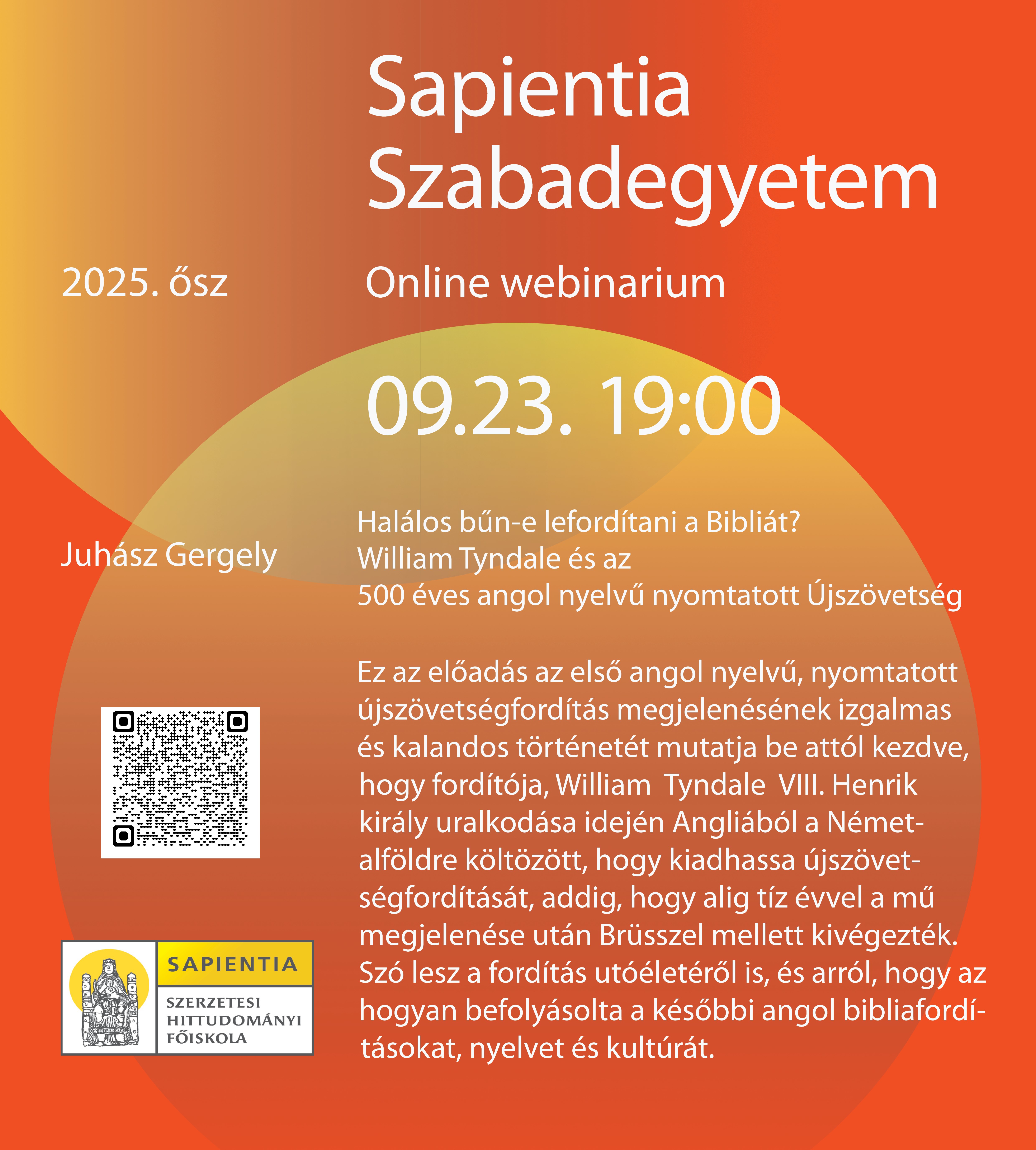 Halálos bűn-e lefordítani a Bibliát? William Tyndale és az 500 éves angol nyelvű nyomtatott Újszövetség címmel tart előadást Juhász Gergely online.