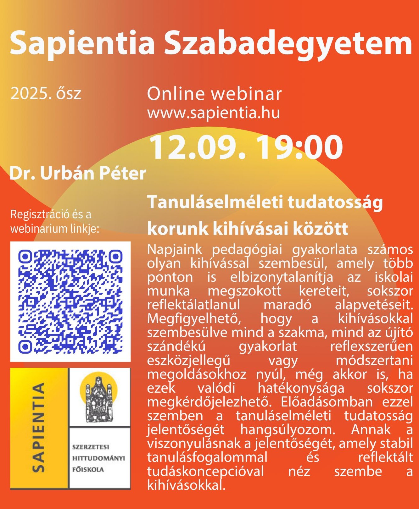 a Pedagógia Tanszék vezetője, főiskolai docens, középiskolai tanár (Budapesti Piarista Gimnázium) előadása