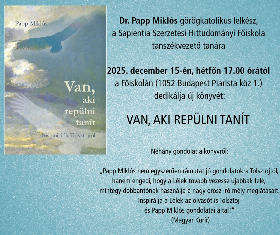 Dátum és időpont 2025. dec. 15., hétfő 17:00–18:00 Helyszín Sapientia Szerzetesi Hittudományi Főiskola 1052 Budapest Piarista köz 1.