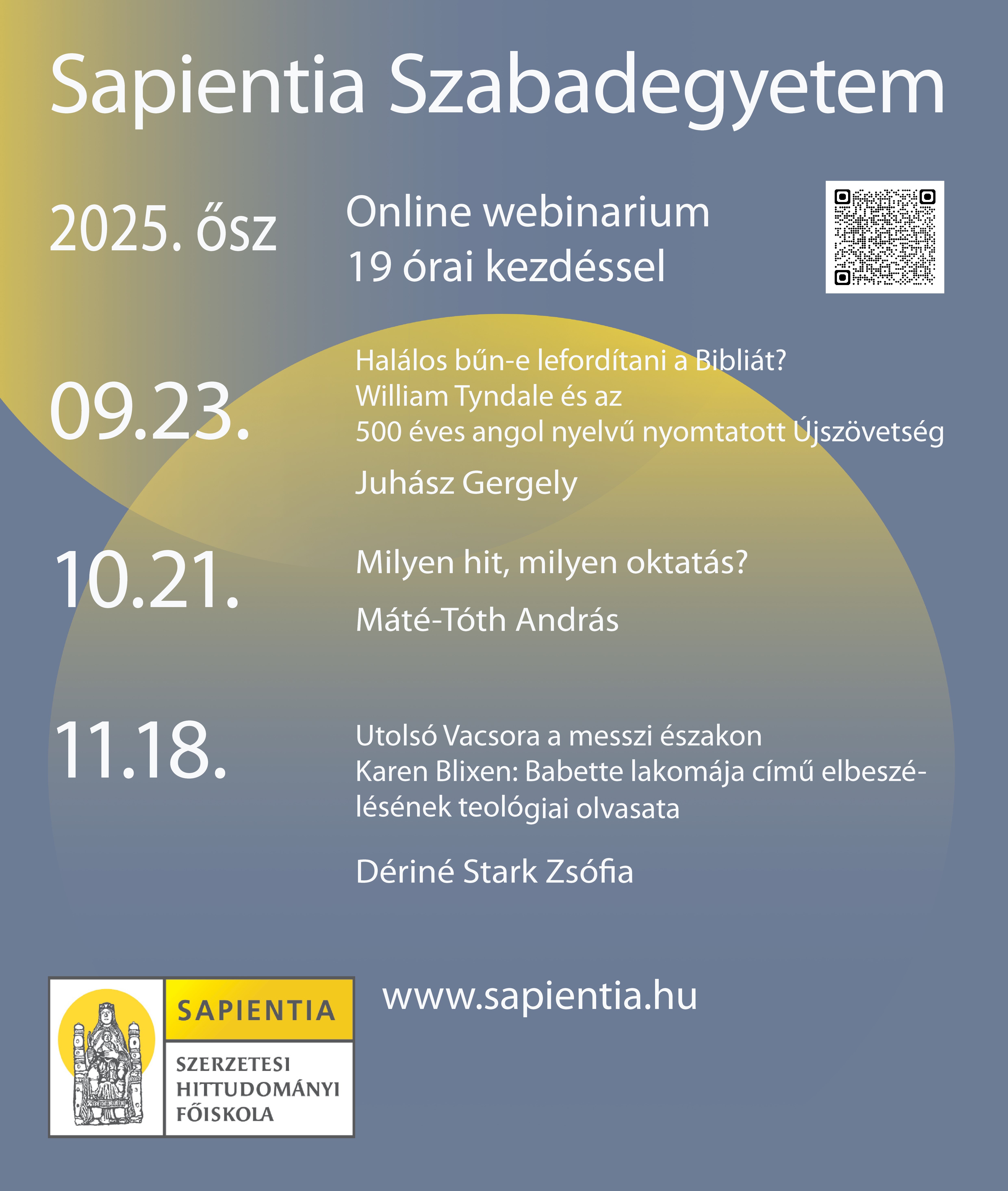 Az alkalmak 19:00 órakor kezdődnek és körülbelül 20:30 óráig tartanak. A rendezvény helyszíne a Sapientia Főiskola (1052 Budapest, Piarista köz 1) vagy online webinarium. Egyes alkalmakról részletesebb információ az eseménynaptárban található.