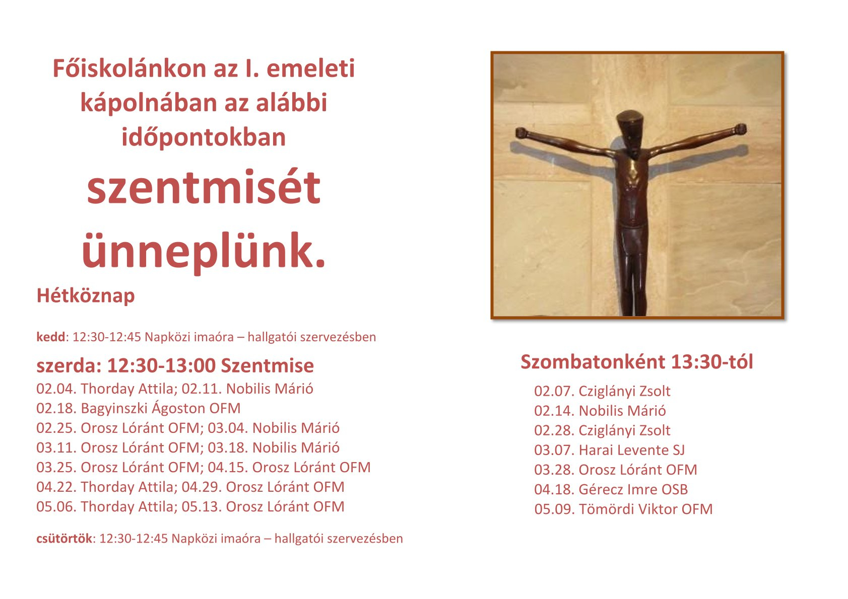 Szentmise és zsolozsma Kápolnánkban szorgalmi időszakban minden szerdán közös szentmisén vehetünk részt: oktatók, munkatársak, hallgatók együtt.Kedden és csütörtökön pedig együtt zsolozsmát imádkozunk. Miserend